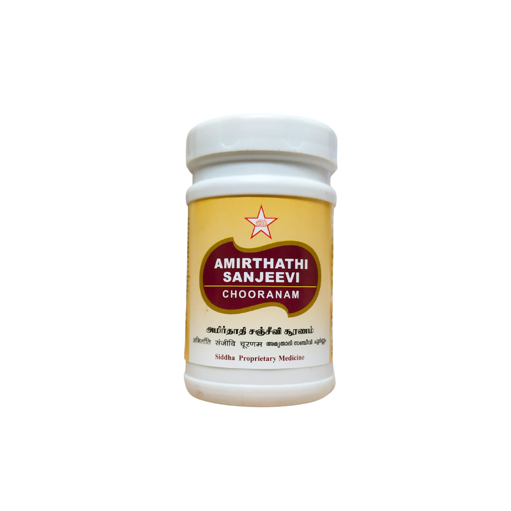 Amirthathi Sanjeevi Churnam is a traditional Siddha herbal formulation from SKM Siddha & Ayurveda, crafted to support kidney health and alleviate urinary tract discomforts. This finely powdered blend combines over 30 medicinal herbs and minerals, including Nannari (Hemidesmus indicus), Kungiliyam (Shorea robusta), and Sathikkai (Myristica fragrans), to promote renal wellness and urinary tract function.